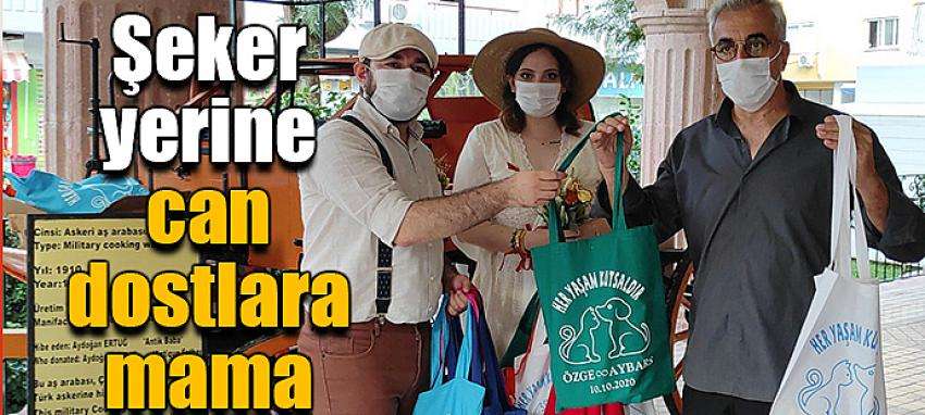 Antalya'nın Alanya ilçesinde evlenen veteriner hekim çift Aybars Akar (32) ve Özge Sevinç Korkmaz (24) nikah töreninde farkındalık için nikah şekeri yerine kedi ve köpek maması dağıttı.