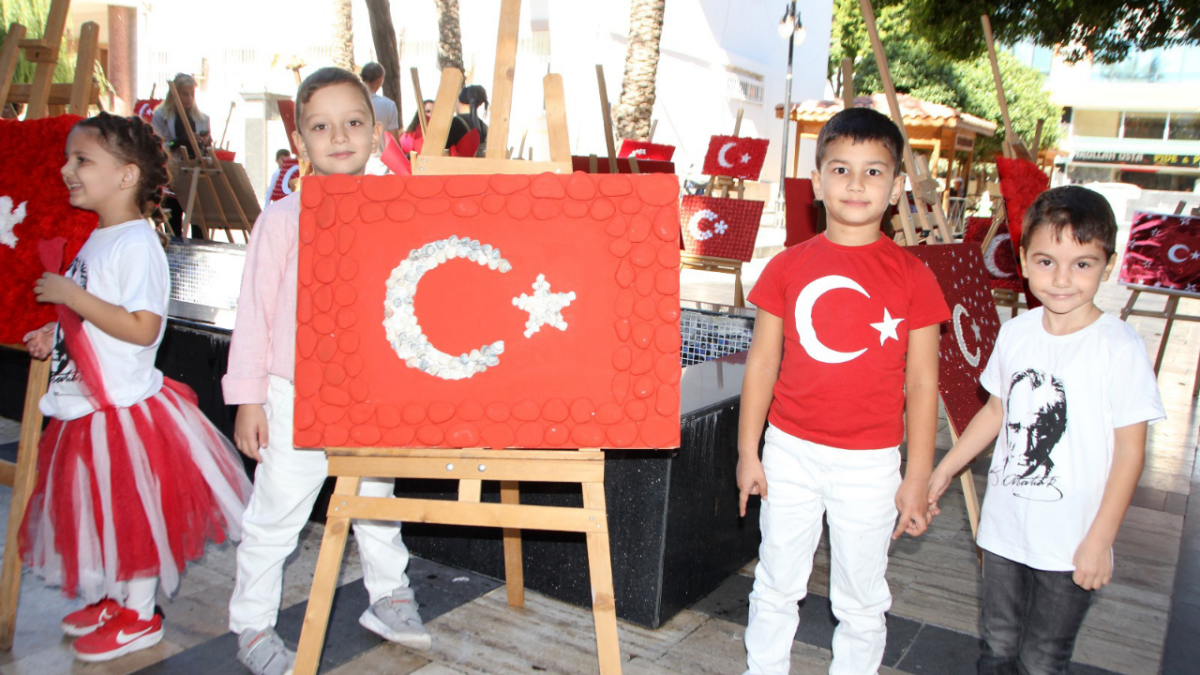 Antalya'nın Serik ilçesinde anaokulu öğrencileri bayrak görselli resim ve elişi sergisi açtı.