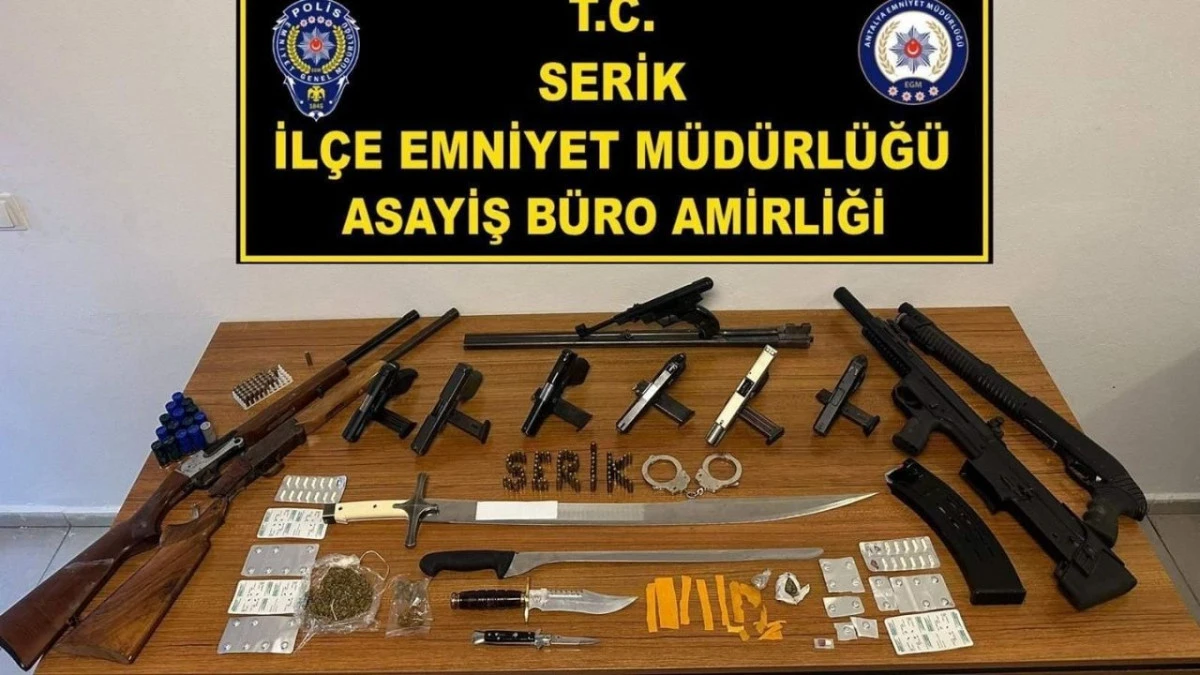 Antalya’nın Serik ilçesinde polis ekiplerince gerçekleştirilen eş zamanlı operasyonda, çok sayıda ruhsatsız silah, uyuşturucu madde ve kesici alet ele geçirildi. Operasyonda 16 şüpheli gözaltına alındı.