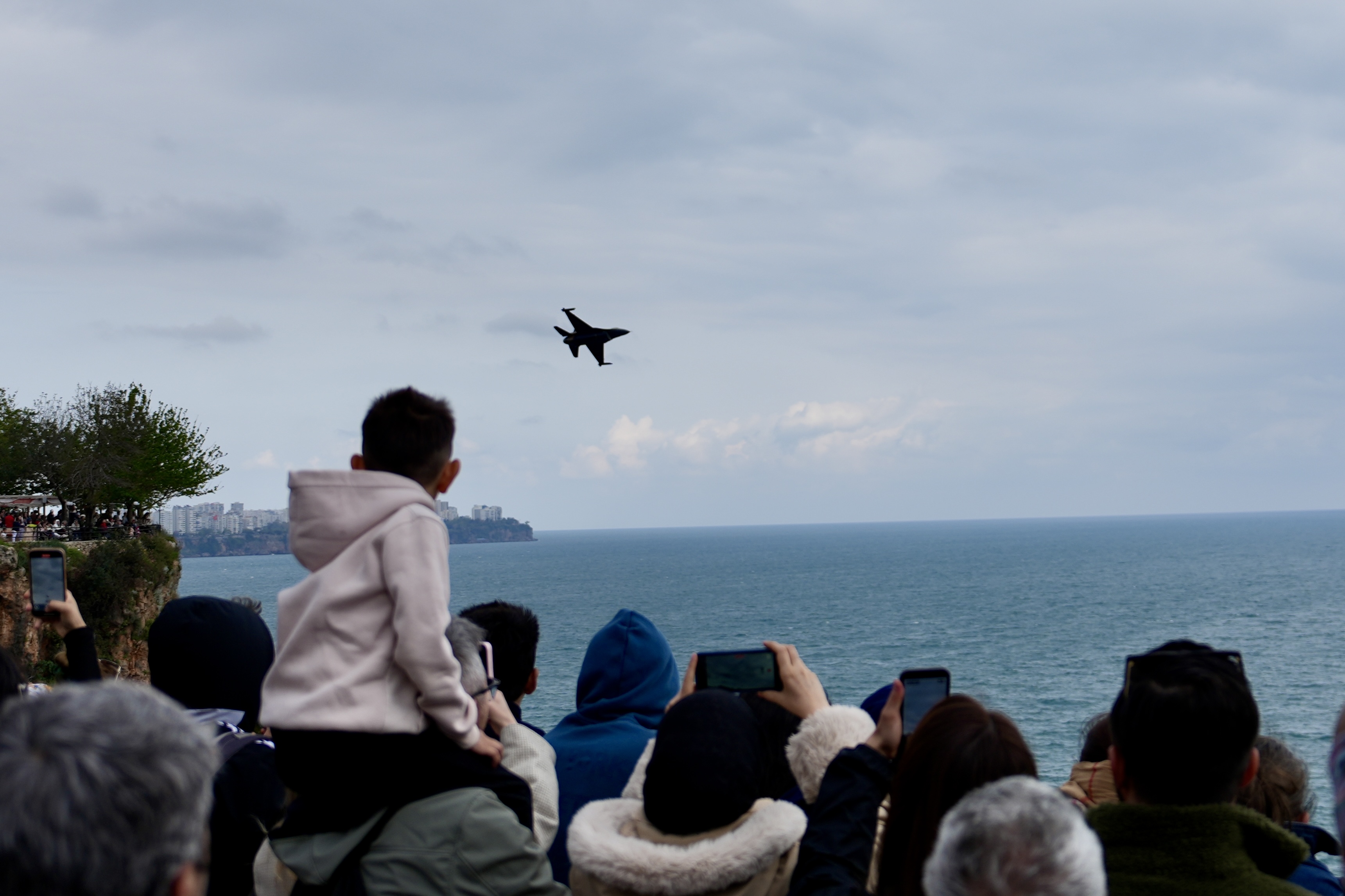 haberimizvar.net- 23 Nisan Ulusal Egemenlik ve Çocuk Bayramı kutlamaları kapsamında Konya Ana Jet Üssü'nden 2 gün önce kente gelen Solo Türk F-16 uçağı, saat 17.00 sıralarında Konyaaltı Sahil Antalya Yaşam Parkı semalarında gösteri uçuşu yaptı. SOLOTÜRK'ün gökyüzündeki gösterisini izlemek isteyenler, Konyaaltı Sahili'ni doldurdu. Saatler öncesinde dünyaca ünlü sahile gelen binlerce vatandaş, SOLOTÜRK'ün gösterisini heyecanla izledi. Sahildeki bir köpeğin koşarak uçağa eşlik ettiği anlar ise gülümsetti.