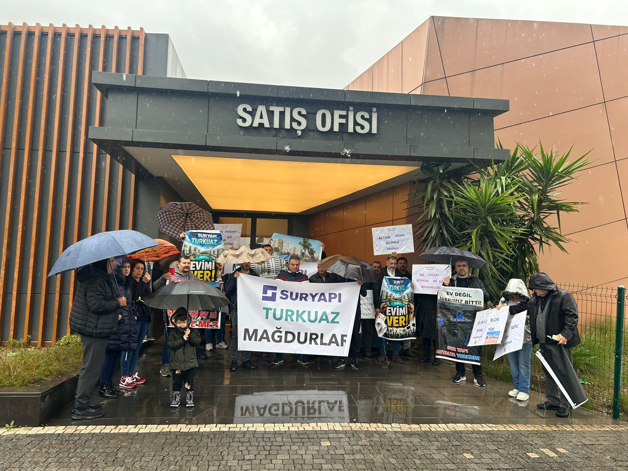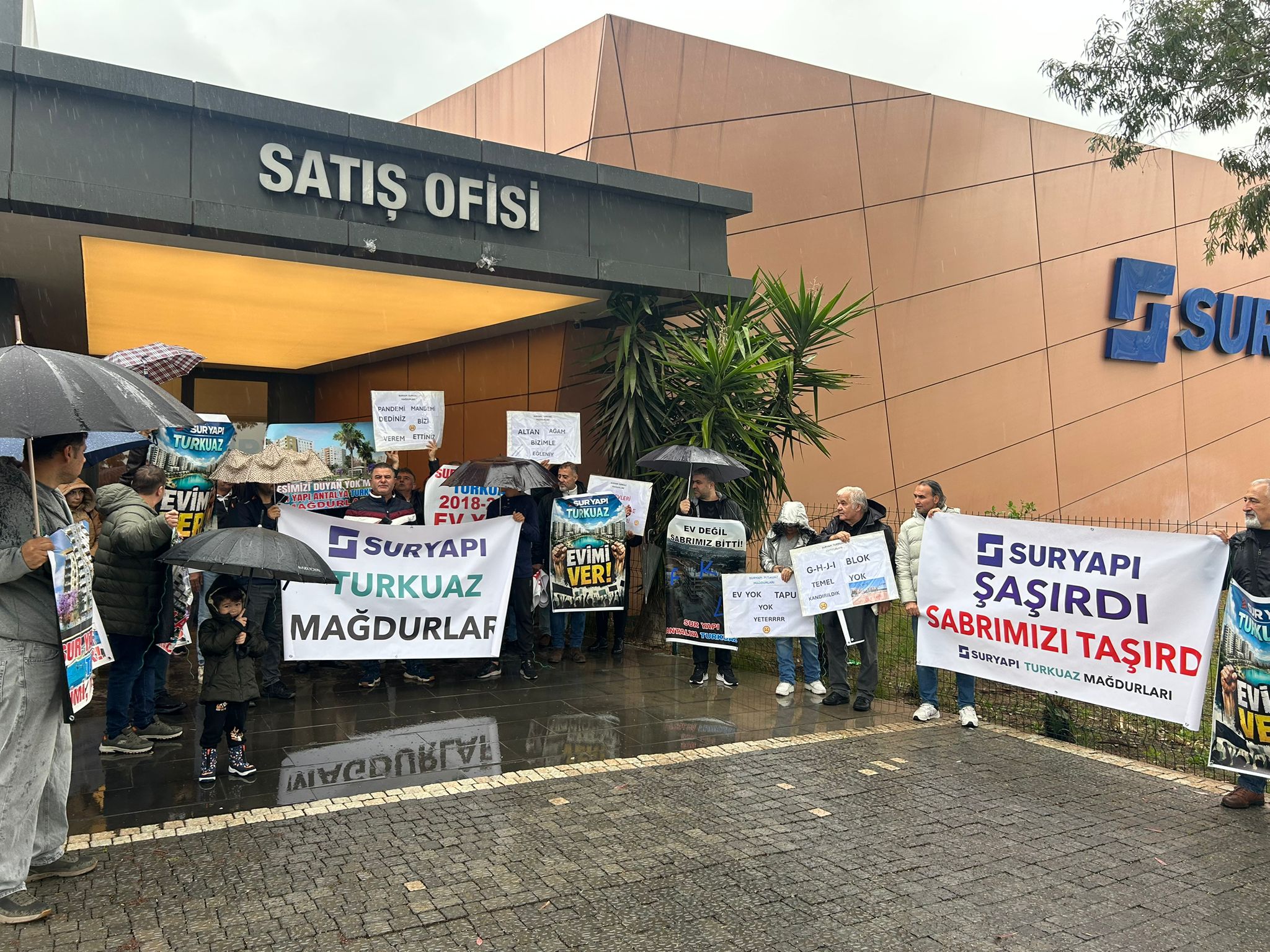 "Bugün burada " Sur Yapı Antalya projesinin parlayan yıldızı olarak pazarlanan Turkuaz Etapları Projesi " adı altında binlerce ailenin geleceğinin nasıl belirsizliğe mahkûm edildiğini haykırmak için toplandık. bugün ne yazık ki birer "umut tacirliği" merkezine dönüşmüştür.