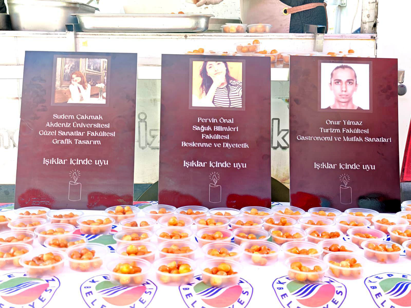 haberimizvar.net- Kepez Belediyesi, ara tatilin ardından memleketlerinden eğitim gördükleri Akdeniz Üniversitesi’ne dönerken, Döşemealtı ilçesinde meydana gelen ve 10 kişinin öldüğü trafik kazasında hayatını kaybeden üç üniversite öğrencisi için lokma hayrı düzenledi. Akdeniz Üniversitesi Doğu girişinde gerçekleştirilen lokma dağıtımı sırasında genç yaşta hayatını kaybeden öğrenciler, dualarla yad edildi. Lokma hayrı; Akdeniz Üniversitesi Güzel Sanatlar Fakültesi Grafik Tasarım Bölümü öğrencisi Sudem Çakmak (19), Sağlık Bilimleri Fakültesi Beslenme ve Diyetetik Bölümü öğrencisi Pervin Önal (22) ile Turizm Fakültesi Gastronomi ve Mutfak Sanatları Bölümü öğrencisi Onur Yılmaz (21) anısına gerçekleştirildi.