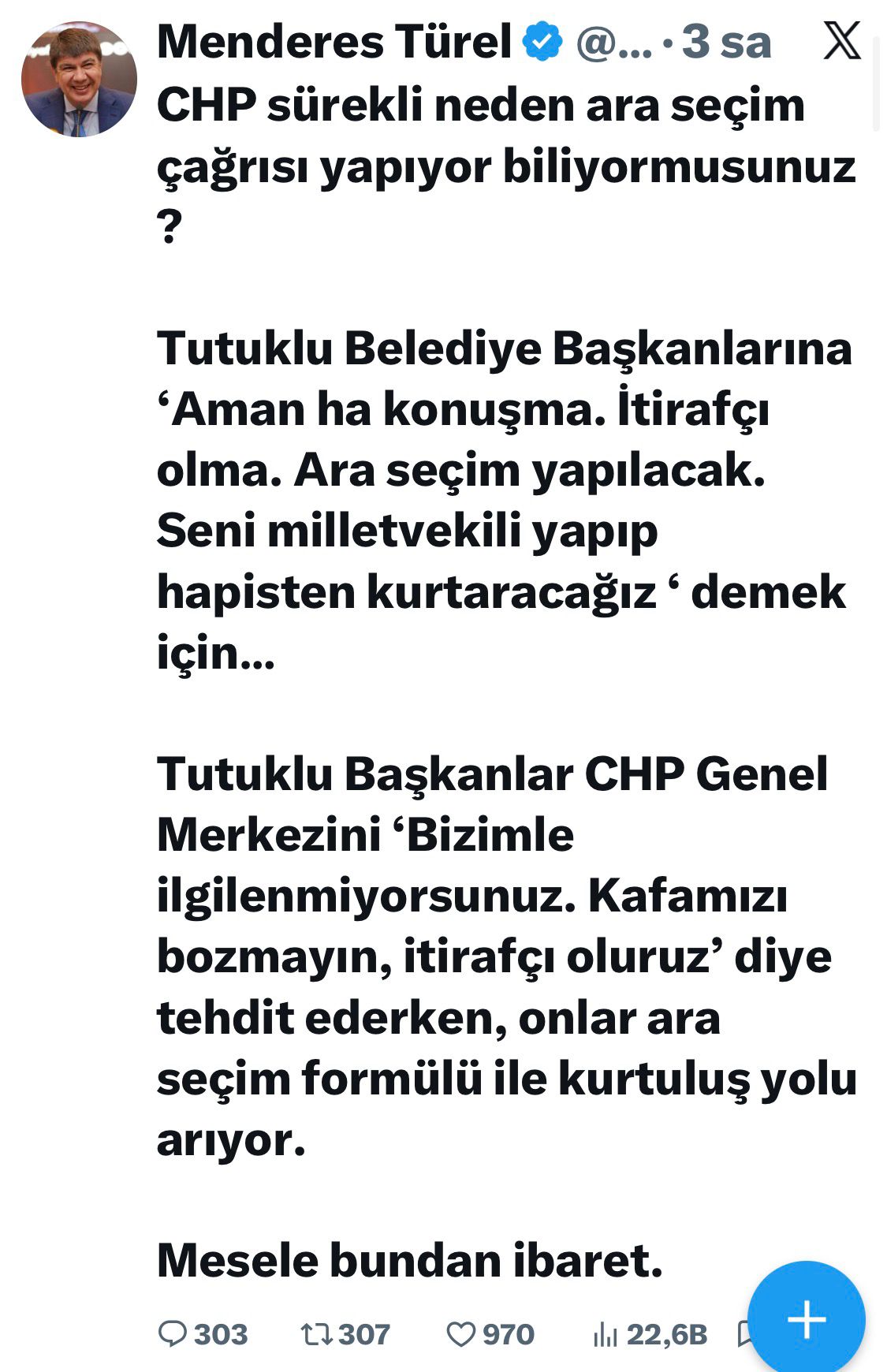 AK Parti MKYK Üyesi Menderes Türel, sosyal medya hesaplarından yaptığı paylaşımda şu ifadeleri kullandı: