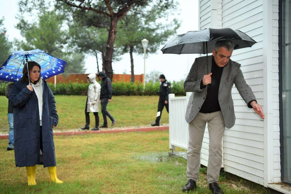 Konyaaltı Belediye Başkanı Semih Esen, HayatPark içerisinde yapımı devam eden nikah salonu ve otizm merkezi çevresinde yapılan çalışmaları yağmur, çamur demeden yerinde inceledi.