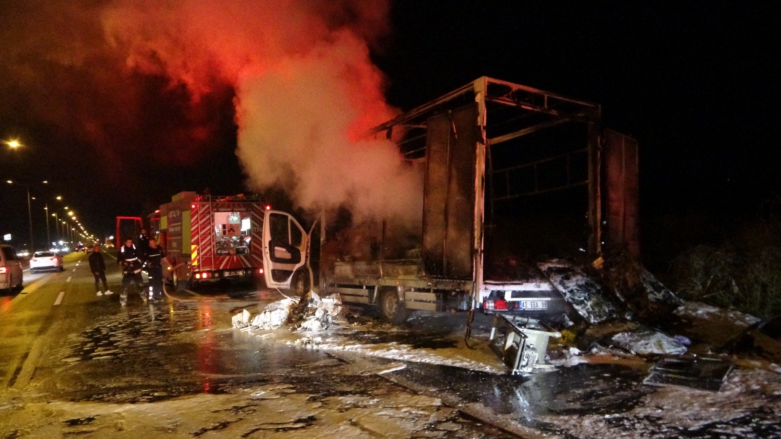 haberimizvar.net- Edinilen bilgiye göre, Antalya’dan yüklediği eşyaları Manavgat’a getirmekte olan Ali Çetinkaya’nın kullandığı 42 EEA 98 plakalı nakliye aracı, Ilıca-Kumköy kavşağını geçtikten kısa bir süre sonra eşyaların bulunduğu bölümden yanmaya başladı. Araçtan inen araç sürücüsü, 112 Acil Çağrı Merkezini arayarak yardım istedi. Bir anda alevlerin sardığı araçta araç sürücüsünün patlayabilecek malzemeler olduğunu söylemesi nedeniyle diğer sürücüler yanan araca müdahale edemezken, bölge trafik istasyon amirliği ekipleri gelerek yolda gerekli önlemleri aldı.