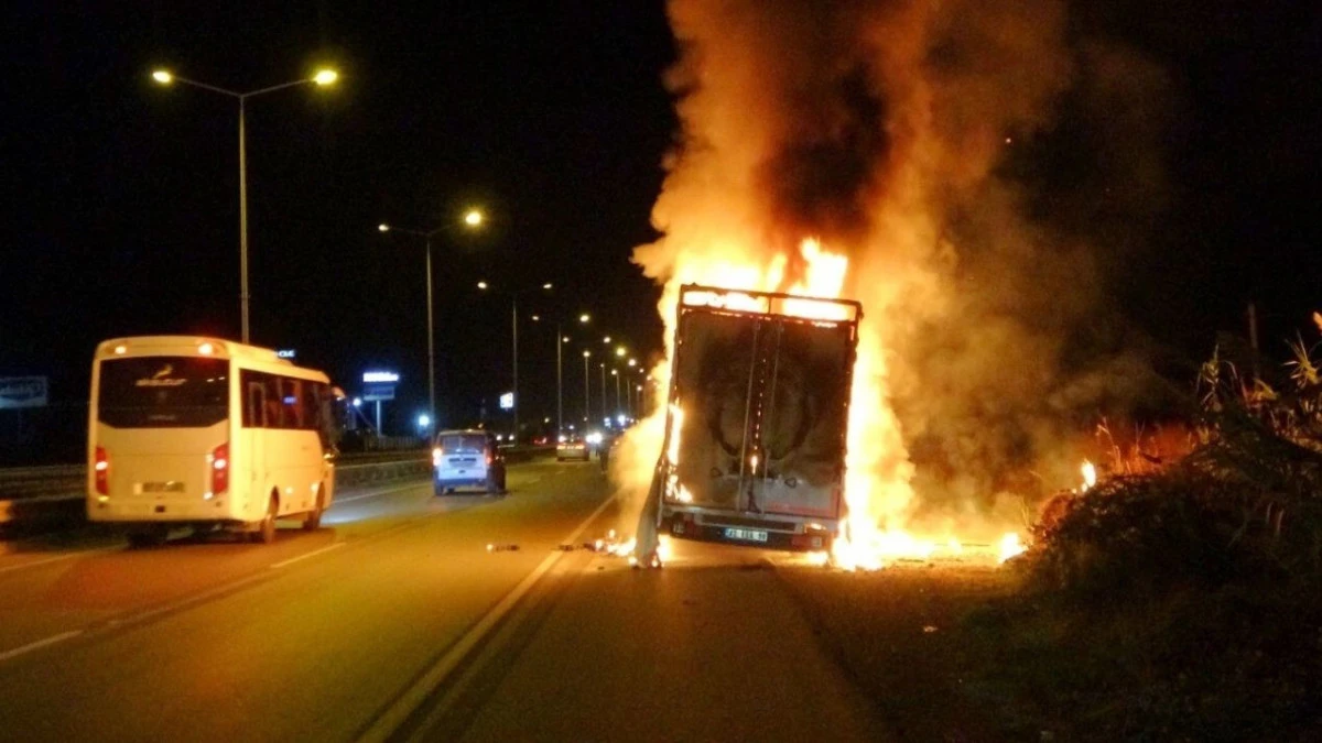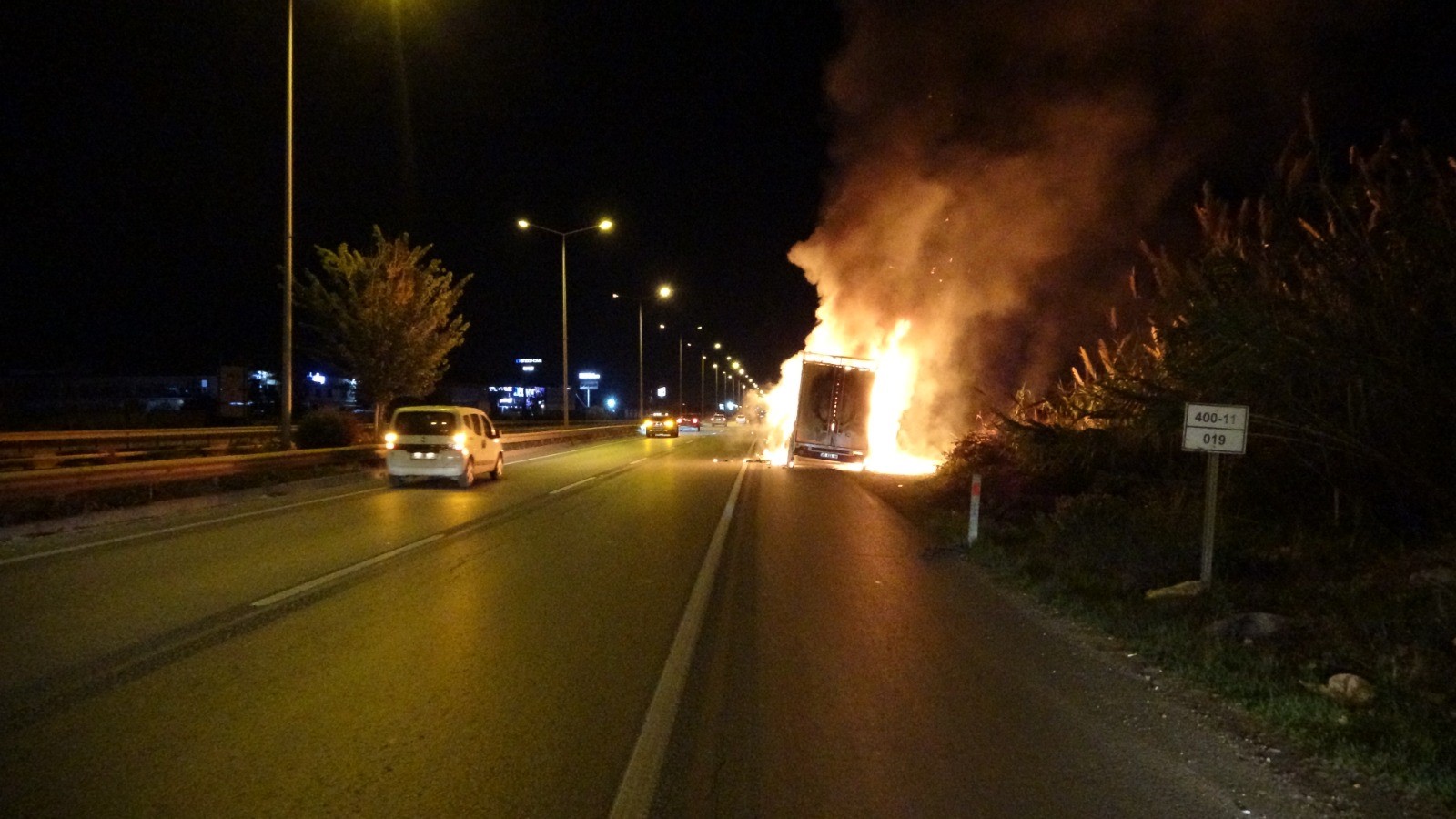 Antalya’nın Manavgat ilçesinde seyir halindeki nakliye aracı alev alev yanarak küle döndü, içerisindeki çok sayıda elektronik eşya kullanılamaz hale geldi.